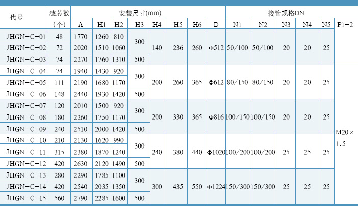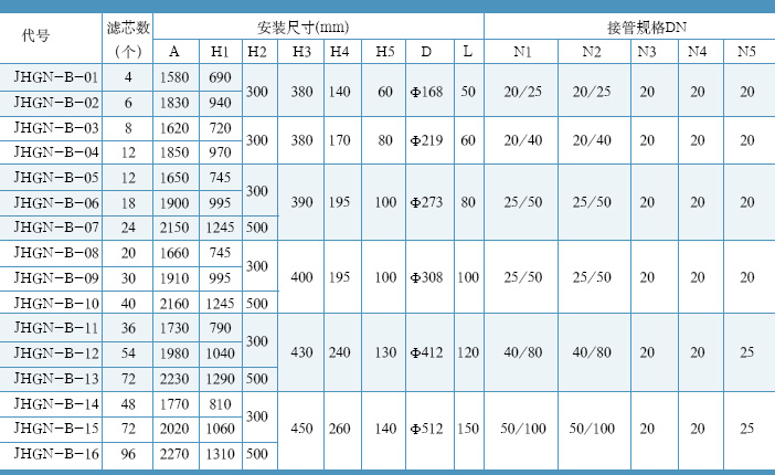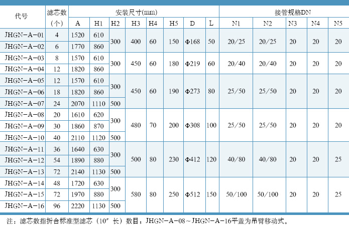 注:滤芯数指折合标准型滤芯(10″长)数目;JHGN-B-08~JHGN-B-16平盖为吊臂移动式。