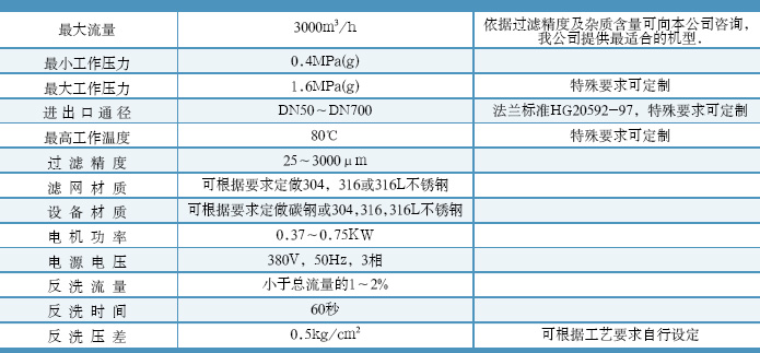 说明:由于物料特性各不相同,我们将根据相关参数定性设计,请详细提供以下参数(流量m 3/h、过滤精度μm、压力MPa、密度kg/m3、粘度CP及杂质含量)并致电本公司索取相关产品安装图。
