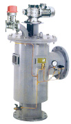 当进出口压差达到0 . 5 k g / c m2时,过滤器的反洗系统会开始自动工作。操作由设置在本体上的压差控制器,电动排污阀及靠马达带动的一个能旋转的不锈钢清洗刷,杂质微粒很容易被钢刷刷下来,然后经排污阀排出,反洗时间持续15秒,反洗时不断流。